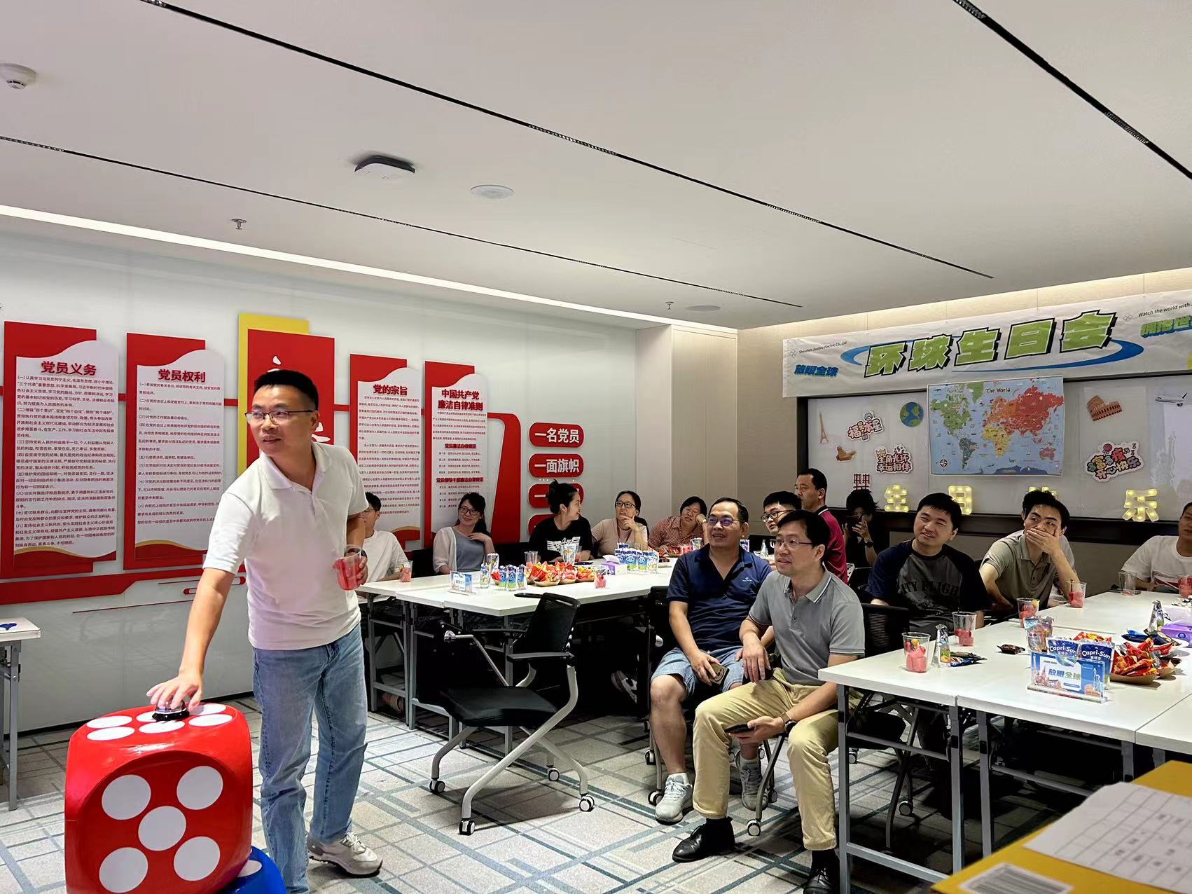 初夏欢歌,共悦生辰, 6月24日,深圳九洲电器组织开展5月、6月员工集体生日会,本次生日会以“环球”为主题,旨在激励大家主动拥抱变化、放眼全球、面向世界!