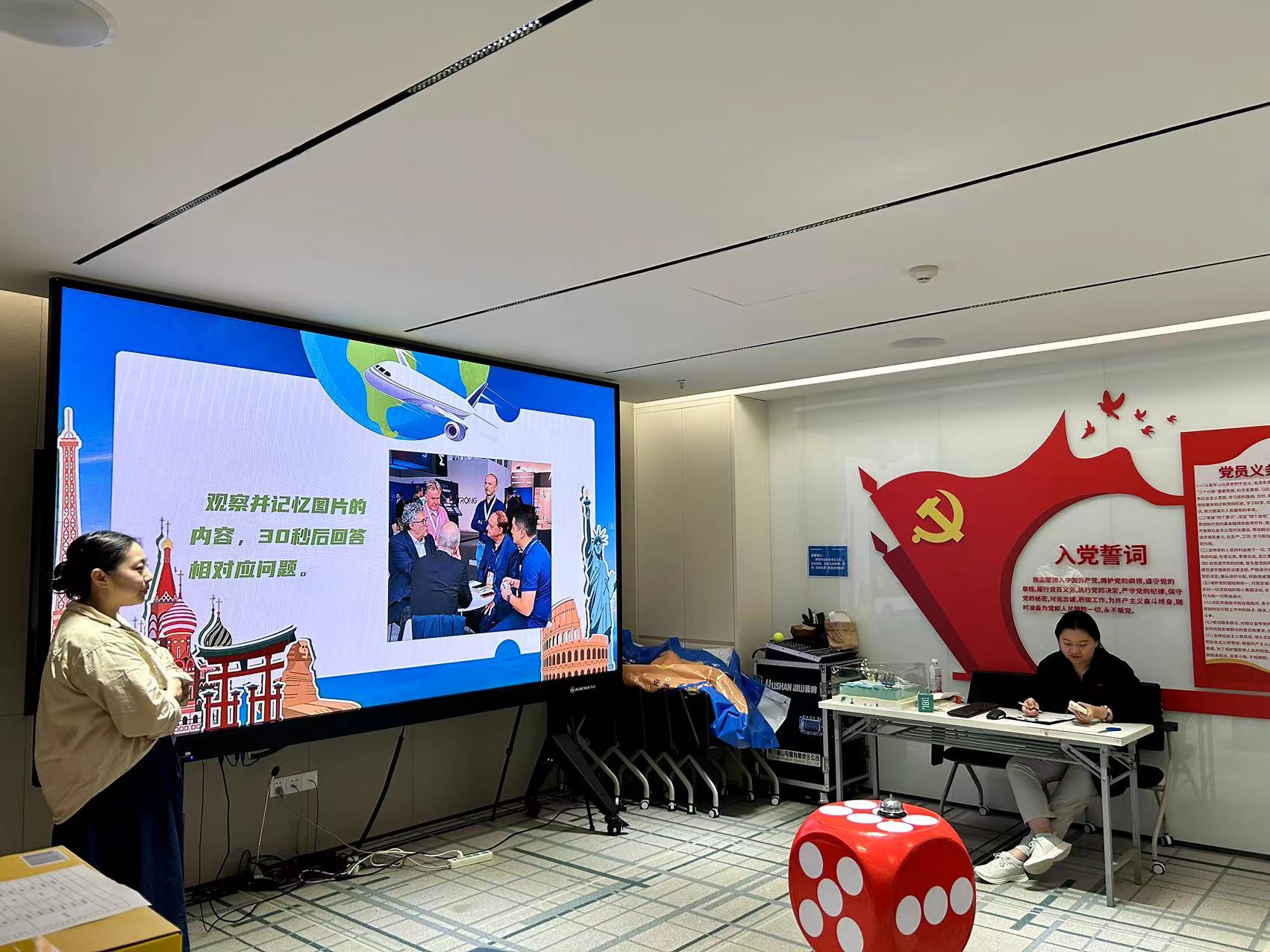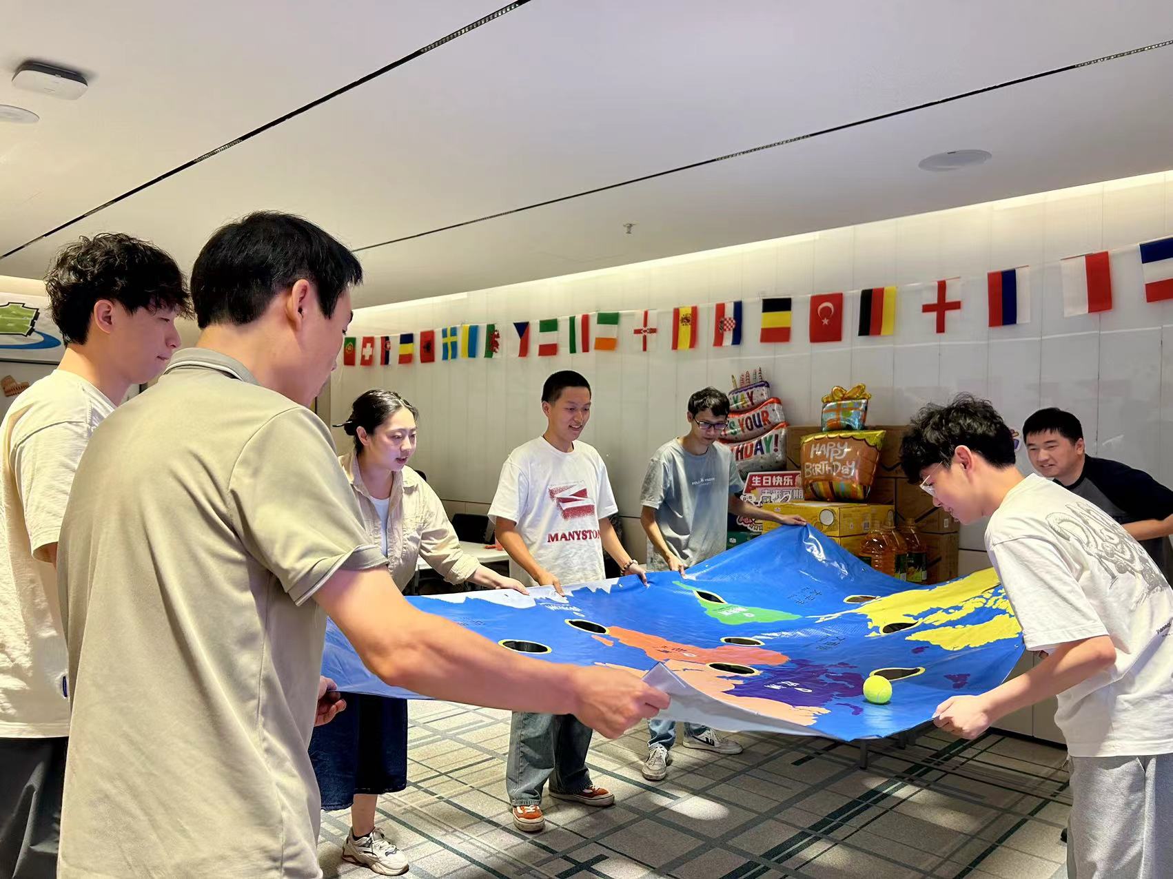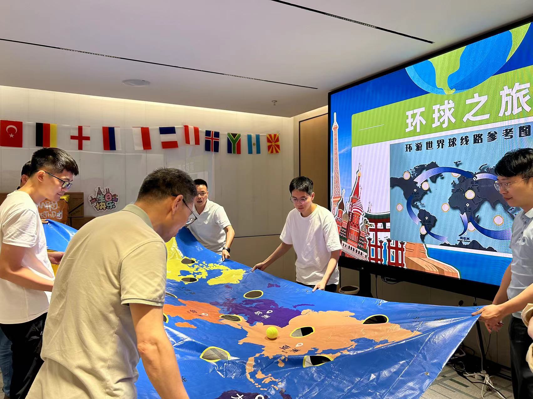 本次生日会的游戏环节,为了贴近“环球”的主题,展现公司作为集团国际贸易桥头堡的风采,寿星们分为“拥抱世界”、“放眼全球”两个队伍,开始了两轮精彩对决!