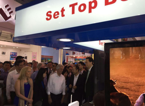 10月17日,展会第三天,乌拉圭总统塔瓦雷·巴斯克斯莅临九洲展位。集团公司副总经理霞晖介绍了九洲的整体业务情况。