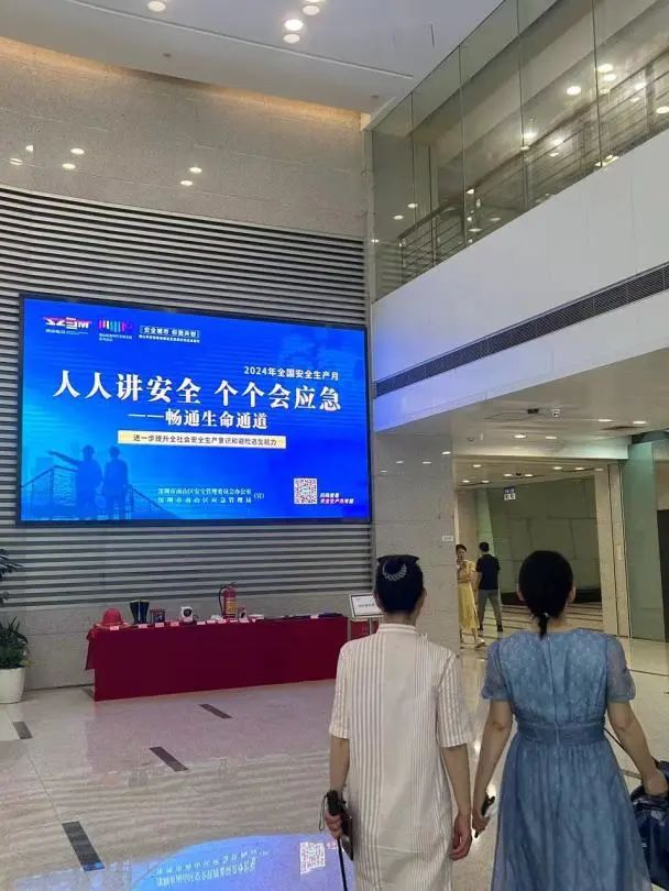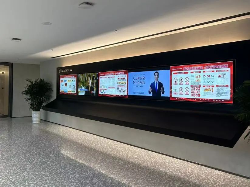 宣传电子屏处,循环播放“安全责任制”、“畅通安全通道”、“强化安全防范措施”等宣传海报和视频