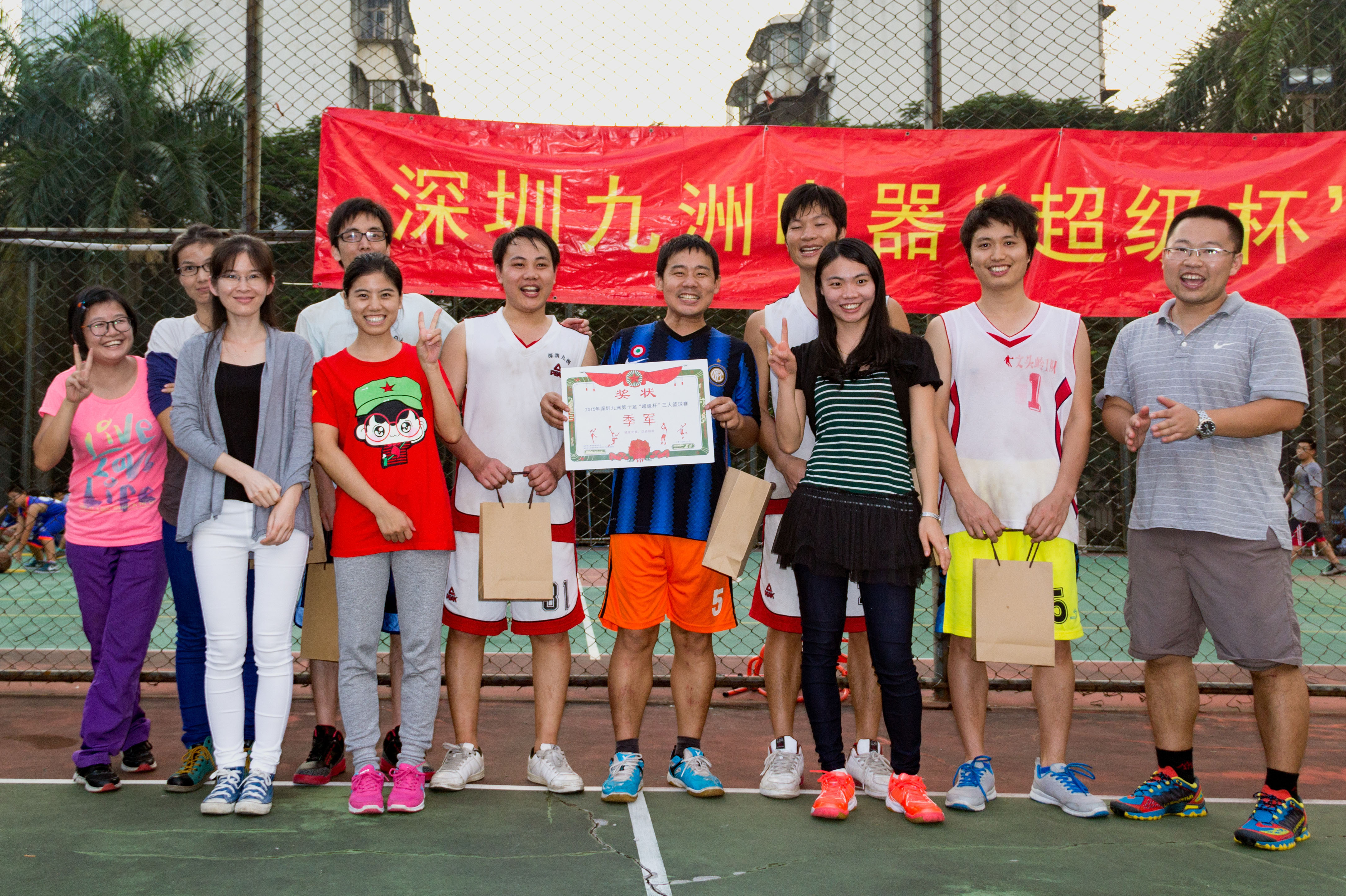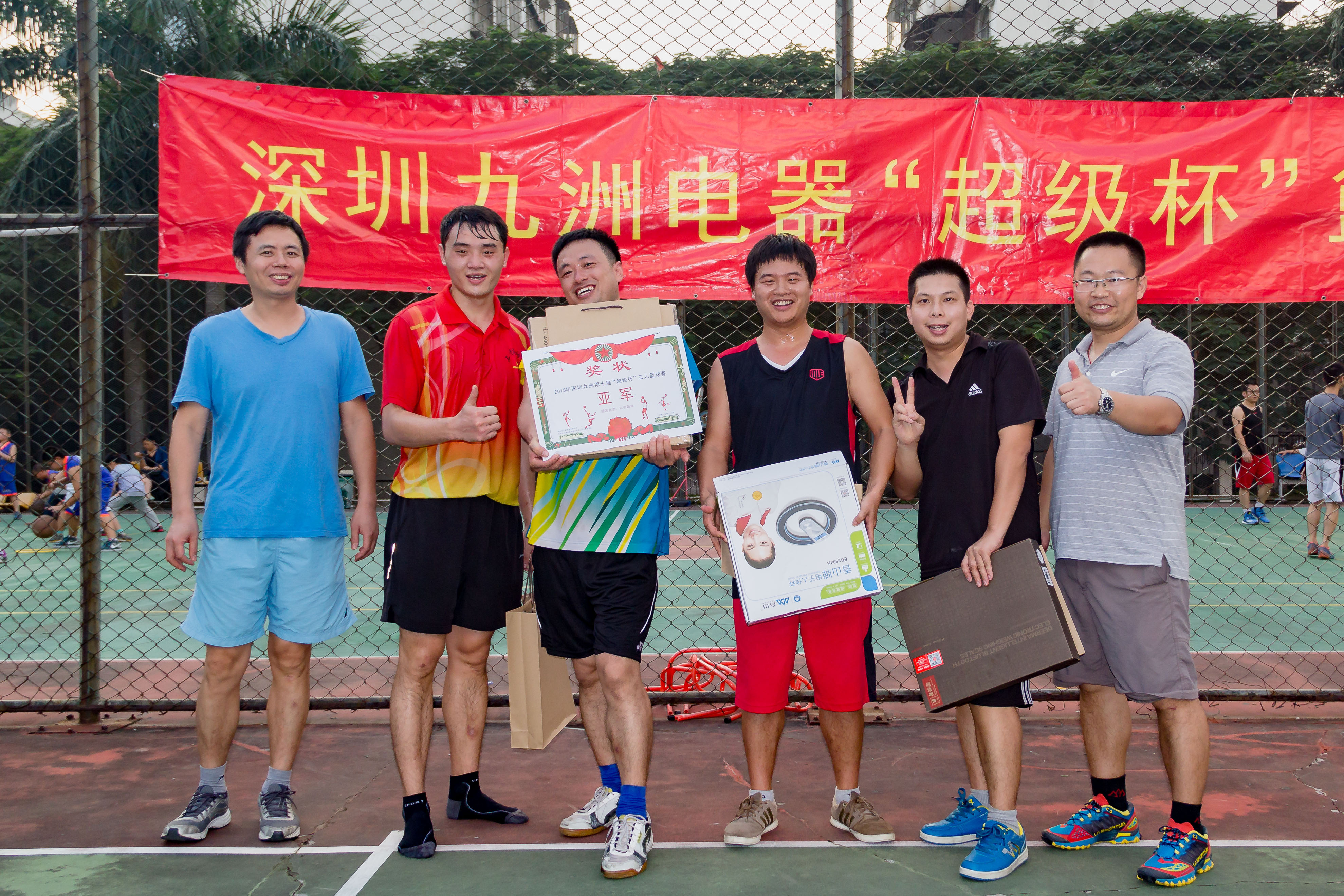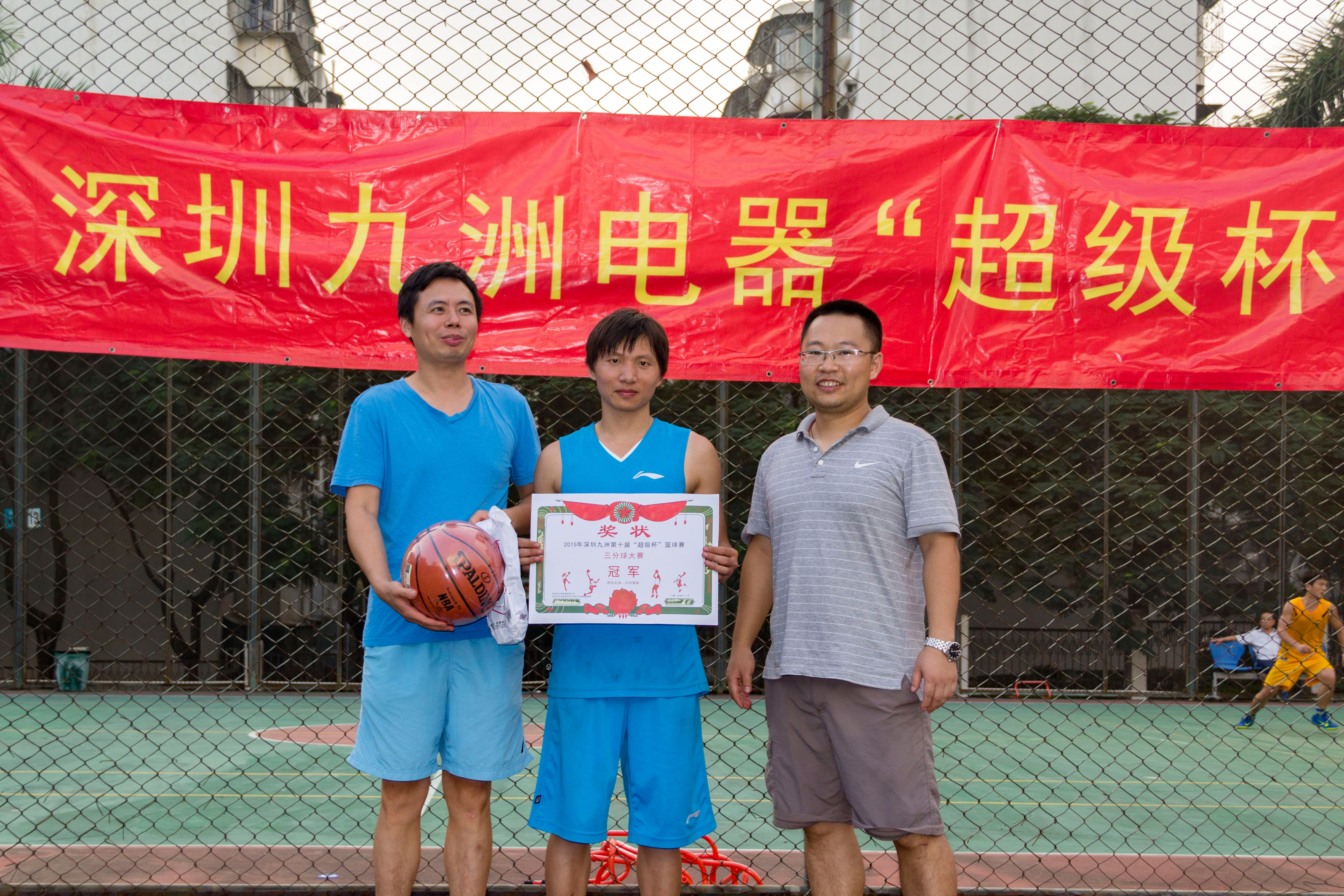 2015年11月14日,下午13时,深圳九洲第八届“超级杯”篮球赛随着一声哨响正式拉开战幕。 报名参加比赛有12支队伍,分为4个小组进行比赛淘汰制,运动员们在场下是亲密无间的同事,在球场上却是你争我赶,不放过任何一个得分的机会?;逗羯⒑炔噬似鸨朔?,经过3小时的艰苦鏖战,篮筐终结者凭借良好的团队配合和战术运用,最终获得冠军;亚军“技术支持部”、季军“515又浪”、3分球冠军程炳财,本届篮球赛圆满结束。