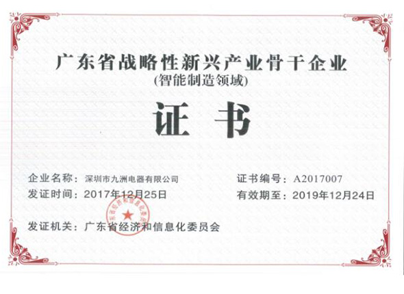 经形式审查和专家评审,深圳九洲电器以在数字音视频产业和技术开发的数字化生产运营与管理、网络化内外部服务系统平台优势,以及数字卫星、地面、有线机顶盒制造行业的领先地位,从全省16个地市43家优秀企业中脱颖而出,被认定为“2017年省战略性新兴产业骨干(培育)企业(智能制造领域)”10家骨干企业。