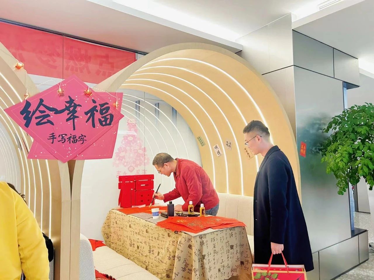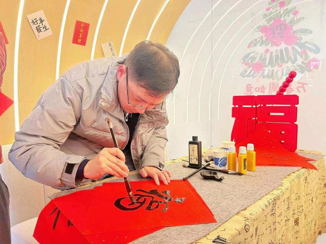 “心中有丘壑,笔墨作山河”,大家在铺开的春联纸上,写下苍劲有力、潇洒自如的福字,将浓浓的情谊、真诚的祝福,倾注于字里行间。